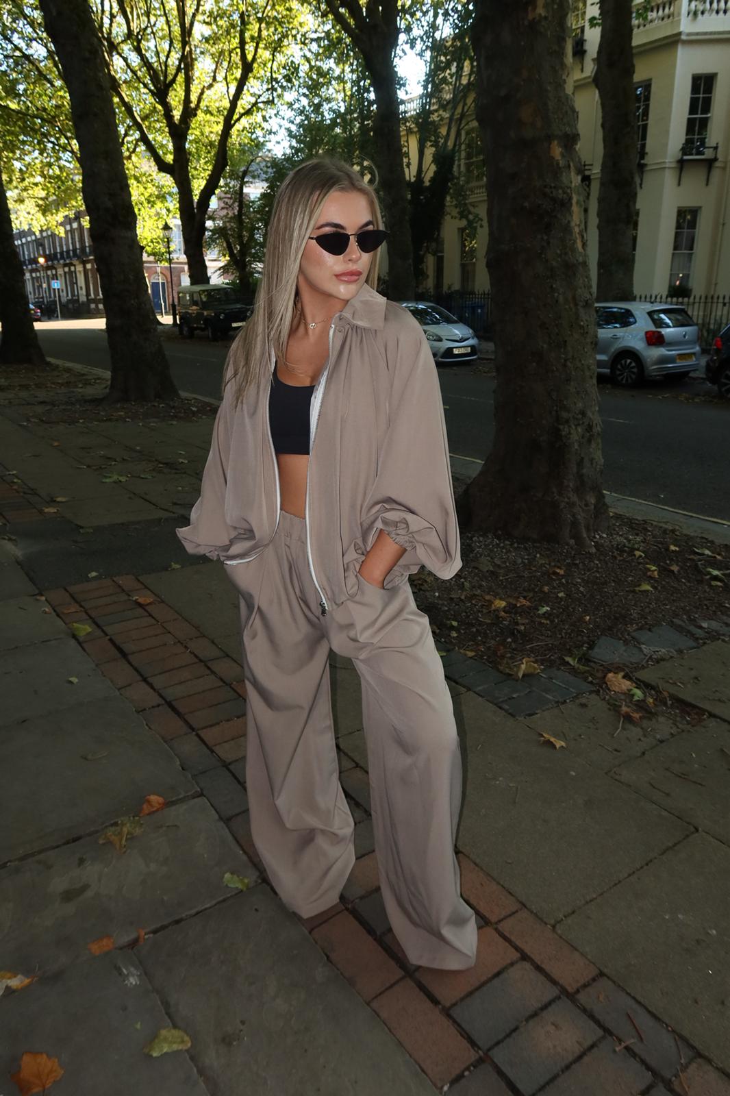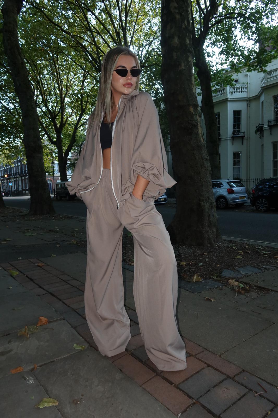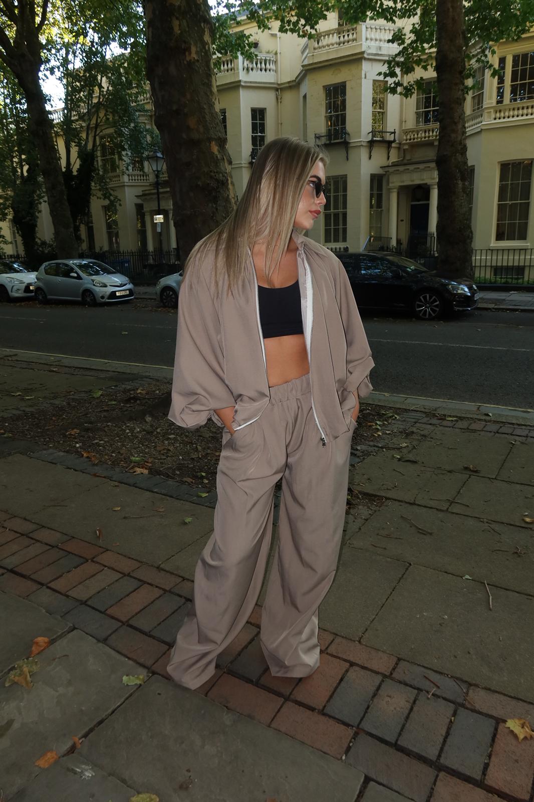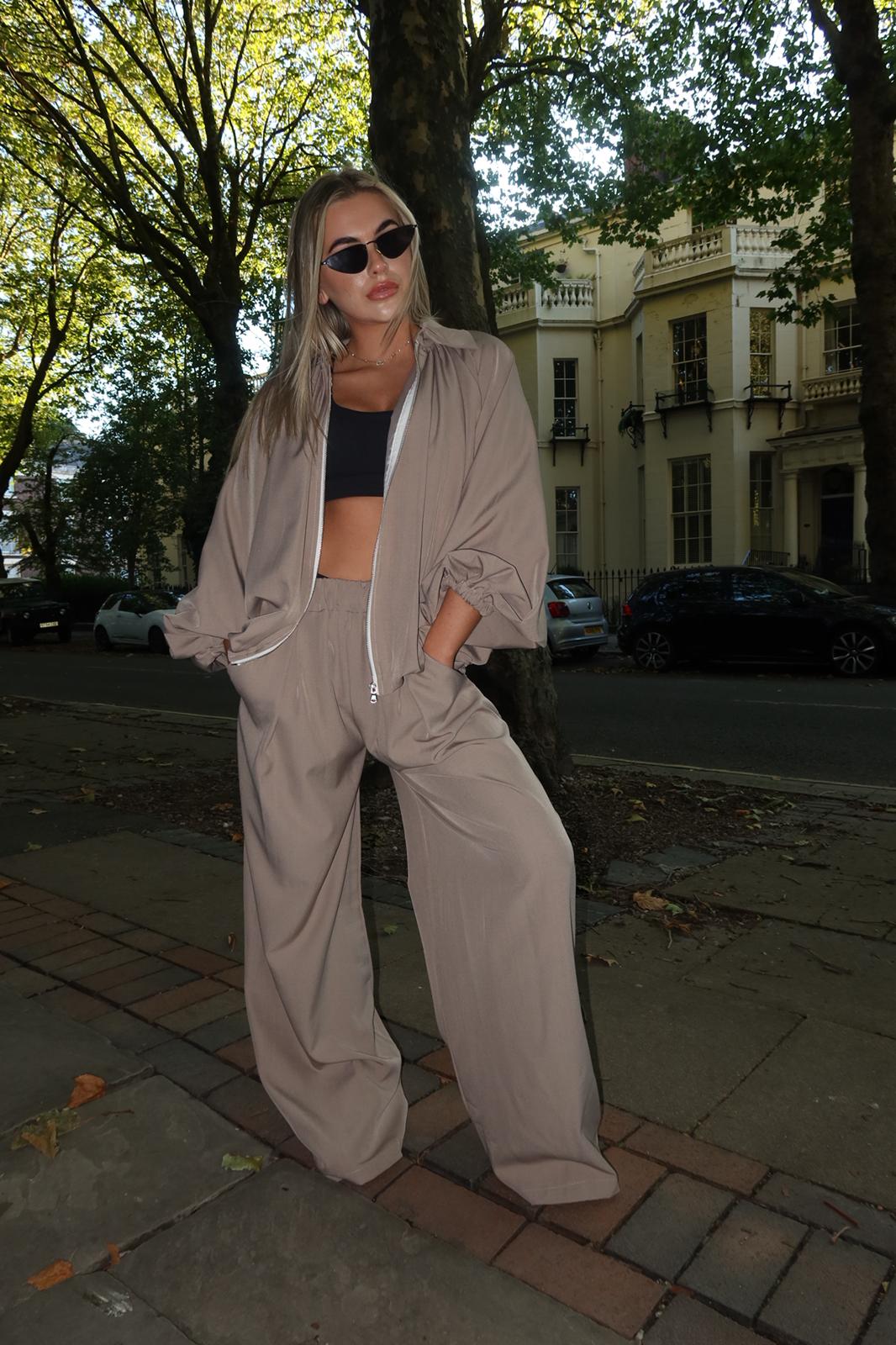 Stay on trend with this oversized taupe co-ord featuring a relaxed zip jacket and wide-leg trousers. Perfect for off-duty looks, travel, or everyday wear, this neutral two-piece blends comfort with effortless style.