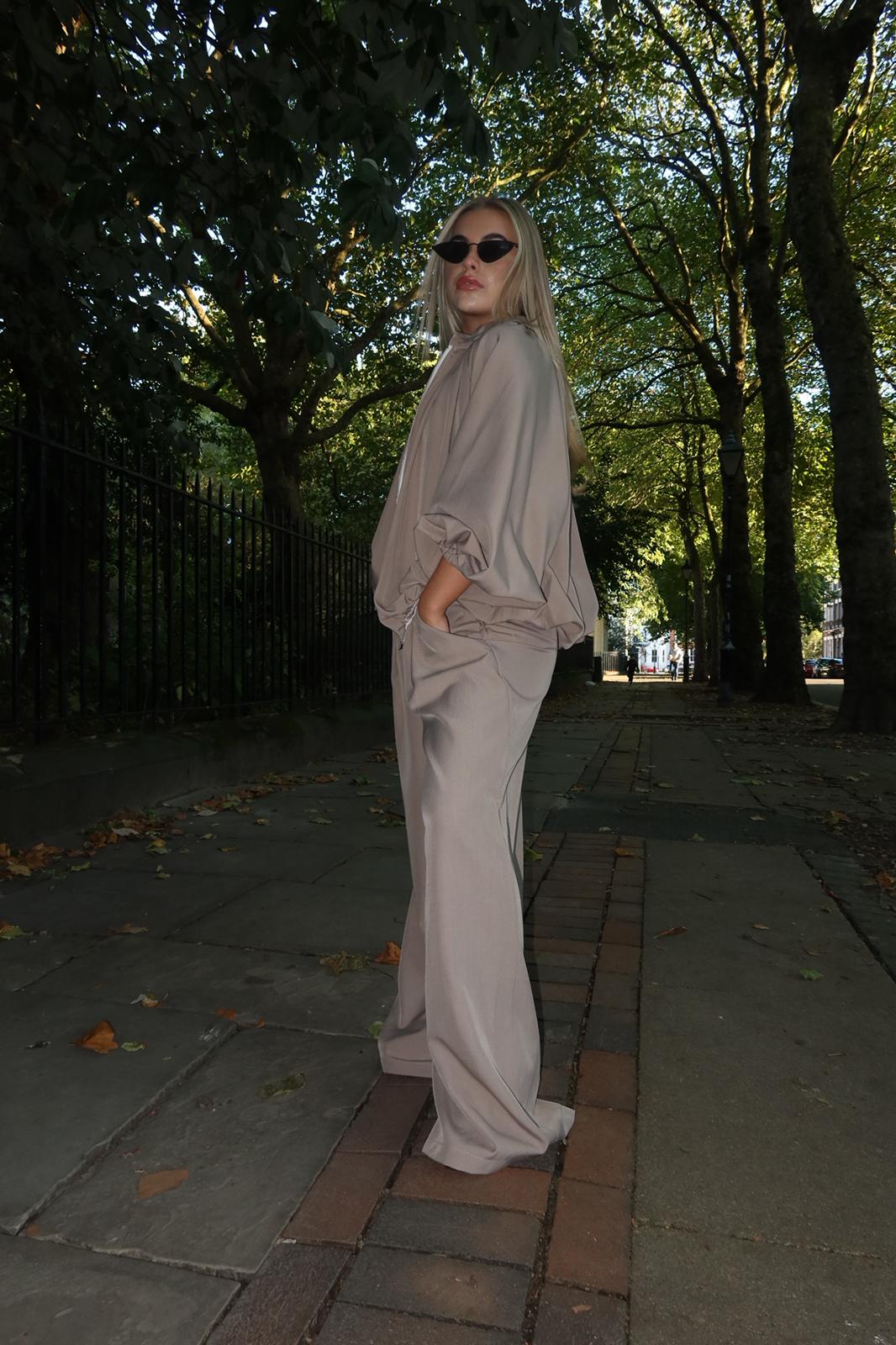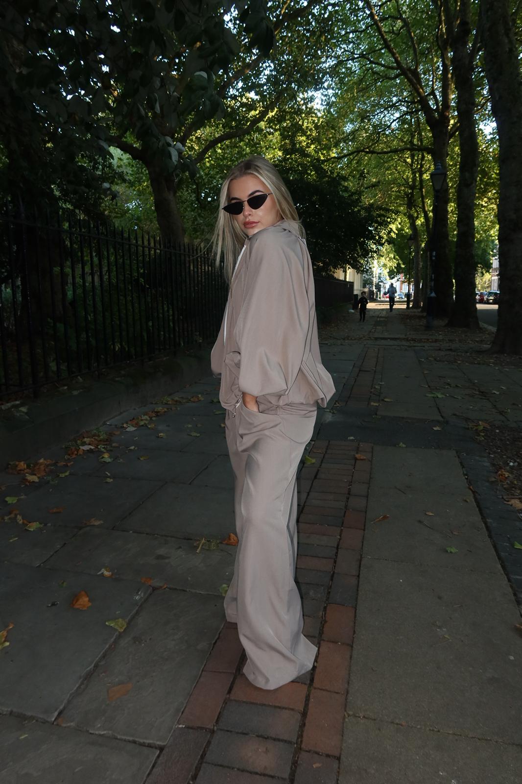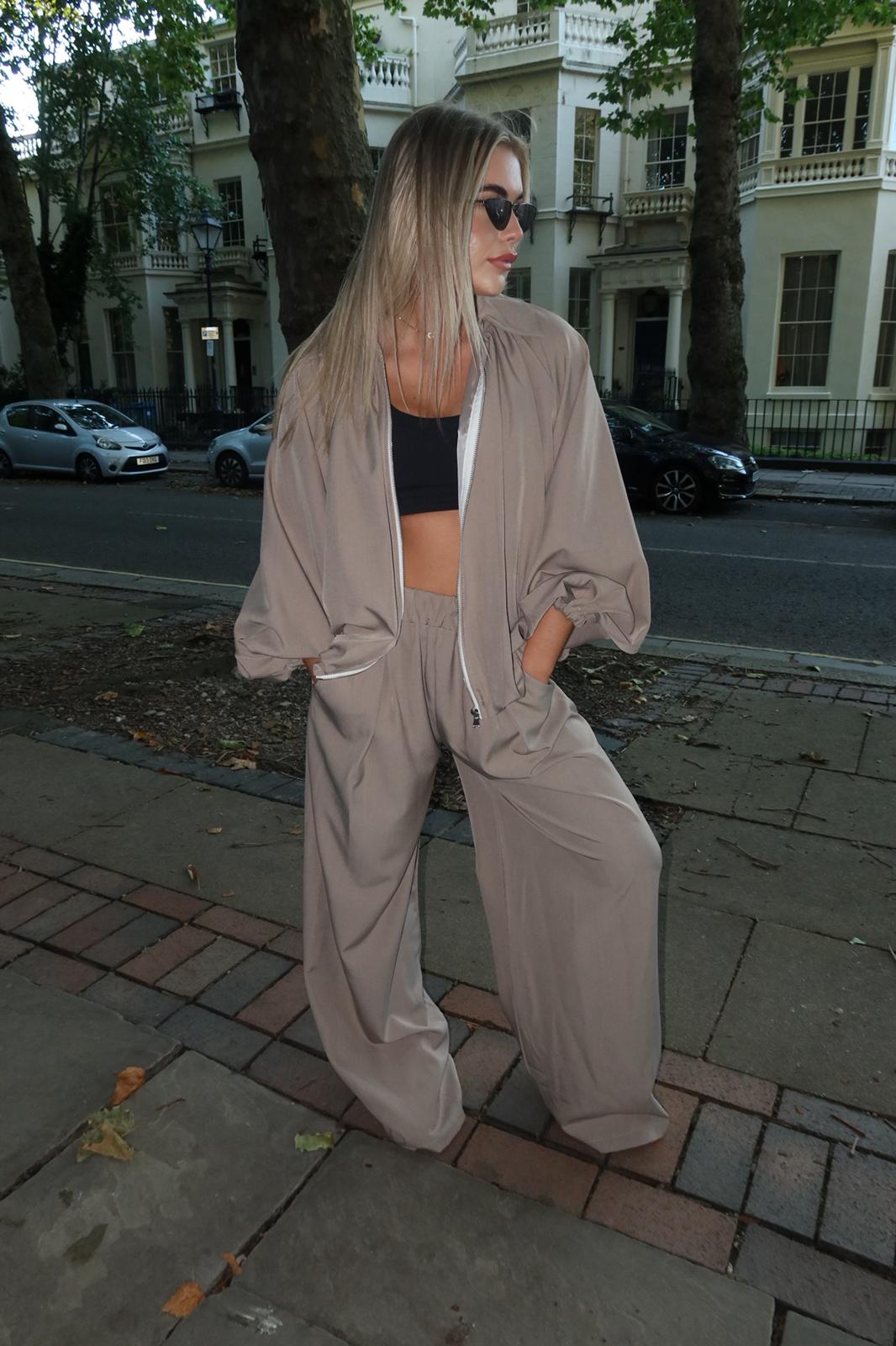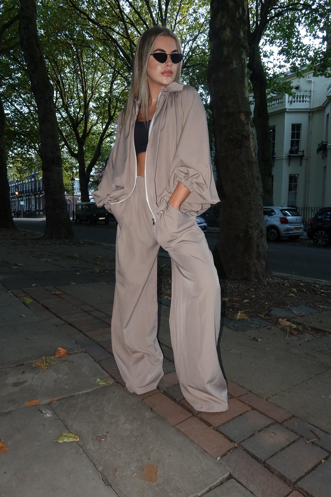 Stay on trend with this oversized taupe co-ord featuring a relaxed zip jacket and wide-leg trousers. Perfect for off-duty looks, travel, or everyday wear, this neutral two-piece blends comfort with effortless style.